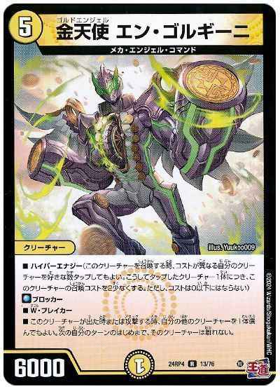 ハイパーエナジー(このクリーチャーを召喚する時、コストが異なる自分のクリーチャーを好きな数タップしてもよい。こうしてタップしたクリーチャー1体につき、このクリーチャーの召喚コストを2少なくする。ただし、コストは0以下にはならない)ブロッカーW・ブレイカーこのクリーチャーが出た時または攻撃する時、自分の他のクリーチャーを1体選んでもよい。次の自分のターンのはじめまで、そのクリーチャーは離れない。