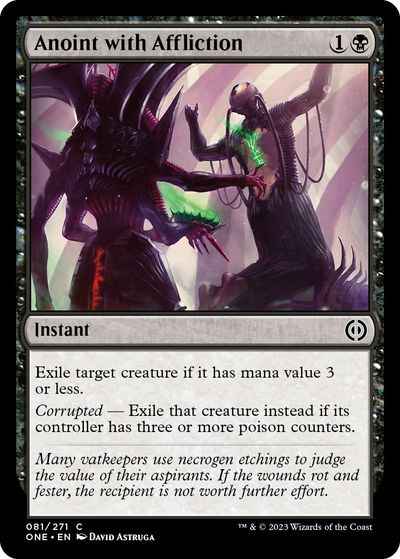 クリーチャー1体を対象とする。それのマナ総量が3以下であるなら、それを追放する。 堕落 ― そのクリーチャーのコントローラーが3個以上の毒(poison)カウンターを持っているなら、代わりにそれを追放する。
