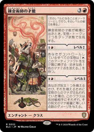 (次のレベルになることはソーサリーとして行う。そのレベルの能力を得る。) 錬金術師の才能が戦場に出たとき、宝物(Treasure)トークン2つをタップ状態で生成する。 (1)(赤):レベル2 あなたがコントロールしているすべての宝物は「(T),このアーティファクトを生け贄に捧げる:好きな色1色のマナ2点を加える。」を持つ。 (4)(赤):レベル3 あなたが呪文1つを唱えるたび、それを唱えるために宝物からのマナが支払われていた場合、このクラス(Class)は各対戦相手にそれぞれ、その呪文のマナ総量に等しい点数のダメージを与える。