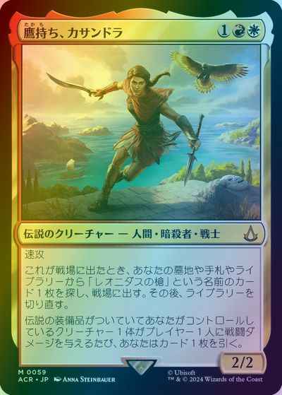 Haste When Kassandra enters the battlefield, search your graveyard, hand, and library for a card named The Spear of Leonidas, put it onto the battlefield, then shuffle. Whenever a creature you control with a legendary Equipment attached to it deals combat damage to a player, draw a card.