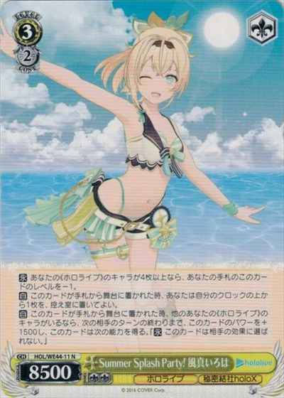 【永】 あなたの《ホロライブ》のキャラが4枚以上なら、あなたの手札のこのカードのレベルを-1。 【自】 このカードが手札から舞台に置かれた時、あなたは自分のクロックの上から1枚を、控え室に置いてよい。 【自】 このカードが手札から舞台に置かれた時、他のあなたの《ホロライブ》のキャラがいるなら、次の相手のターンの終わりまで、このカードのパワーを+1500し、このカードは次の能力を得る。『【永】 このカードは相手の効果に選ばれない。』