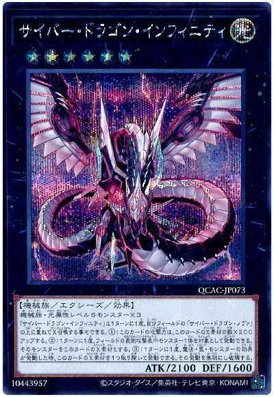機械族・光属性レベル6モンスター×3 「サイバー・ドラゴン・インフィニティ」は1ターンに1度、自分フィールドの「サイバー・ドラゴン・ノヴァ」の上に重ねてX召喚する事もできる。(1):このカードの攻撃力は、このカードのX素材の数×200アップする。(2):1ターンに1度、フィールドの表側攻撃表示モンスター1体を対象として発動できる。そのモンスターをこのカードのX素材とする。(3):1ターンに1度、魔法・罠・モンスターの効果が発動した時、このカードのX素材を1つ取り除いて発動できる。その発動を無効にし破壊する。