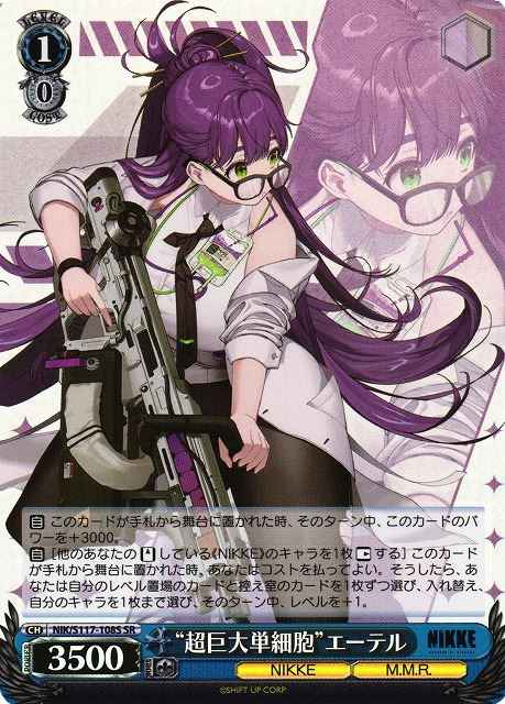 【自】 このカードが手札から舞台に置かれた時、そのターン中、このカードのパワーを+3000。 【自】[他のあなたの【スタンド】している《NIKKE》のキャラを1枚【レスト】する] このカードが手札から舞台に置かれた時、あなたはコストを払ってよい。そうしたら、あなたは自分のレベル置場のカードと控え室のカードを1枚ずつ選び、入れ替え、自分のキャラを1枚まで選び、そのターン中、レベルを+1。