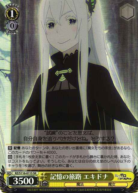 【永】 記憶 あなたのターン中、あなたの思い出置場に「魔女たちの茶会」があるなら、このカードのパワーを+4000。 【自】[手札を1枚控え室に置く] このカードが手札から舞台に置かれた時、あなたはコストを払ってよい。そうしたら、あなたは自分の控え室のレベル0以下のキャラを1枚選び、舞台の好きな枠に置く。