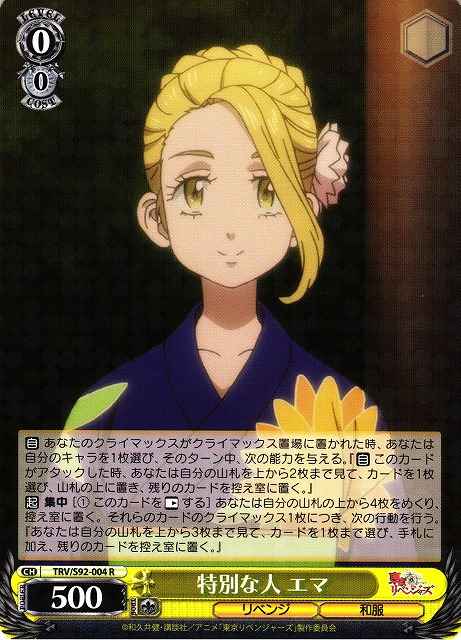 【自】 あなたのクライマックスがクライマックス置場に置かれた時、あなたは自分のキャラを1枚選び、そのターン中、次の能力を与える。『【自】 このカードがアタックした時、あなたは自分の山札を上から2枚まで見て、カードを1枚選び、山札の上に置き、残りのカードを控え室に置く。』 【起】 集中 [(1) このカードを【レスト】する] あなたは自分の山札の上から4枚をめくり、控え室に置く。それらのカードのクライマックス1枚につき、次の行動を行う。『あなたは自分の山札を上から3枚まで見て、カードを1枚まで選び、手札に加え、残りのカードを控え室に置く。』