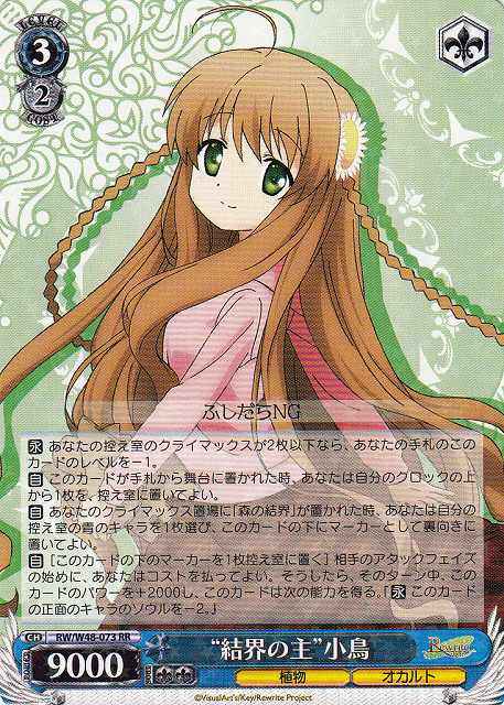 【永】 あなたの控え室のクライマックスが2枚以下なら、あなたの手札のこのカードのレベルを-1。 【自】 このカードが手札から舞台に置かれた時、あなたは自分のクロックの上から1枚を、控え室に置いてよい。 【自】 あなたのクライマックス置場に「森の結界」が置かれた時、あなたは自分の控え室の青のキャラを1枚選び、このカードの下にマーカーとして裏向きに置いてよい。 【自】[このカードの下のマーカーを1枚控え室に置く] 相手のアタックフェイズの始めに、あなたはコストを払ってよい。そうしたら、そのターン中、このカードのパワーを+2000し、このカードは次の能力を得る。『【永】 このカードの正面のキャラのソウルを-2。』