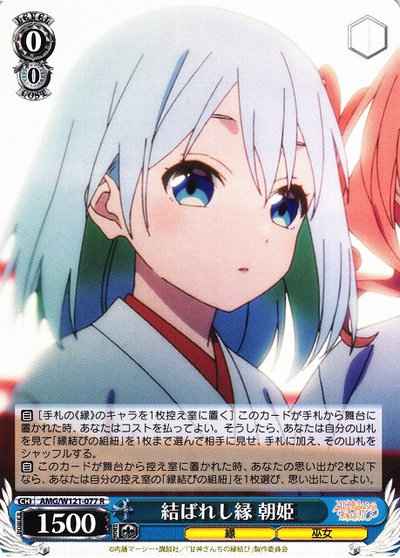 【自】[手札の《縁》のキャラを1枚控え室に置く] このカードが手札から舞台に置かれた時、あなたはコストを払ってよい。そうしたら、あなたは自分の山札を見て「縁結びの組紐」を1枚まで選んで相手に見せ、手札に加え、その山札をシャッフルする。 【自】 このカードが舞台から控え室に置かれた時、あなたの思い出が2枚以下なら、あなたは自分の控え室の「縁結びの組紐」を1枚選び、思い出にしてよい。