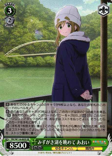 【永】 あなたの《ゆるキャン△》のキャラが4枚以上なら、あなたの手札のこのカードのレベルを-1。 【永】 他のあなたのキャラが3枚以上なら、このカードは次の2つの能力を得る。『【永】 あなたのターン中、このカードのパワーを+2000。』『【自】[(1)] このカードがフロントアタックされた時、あなたはコストを払ってよい。そうしたら、このカードを手札に戻す。』 【自】[手札を1枚控え室に置く] このカードが手札から舞台に置かれた時、あなたはコストを払ってよい。そうしたら、あなたは自分のクロックの上から1枚を、ストック置場に置く。