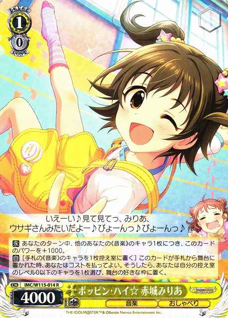 【永】 あなたのターン中、他のあなたの《音楽》のキャラ1枚につき、このカードのパワーを+1000。 【自】[手札の《音楽》のキャラを1枚控え室に置く] このカードが手札から舞台に置かれた時、あなたはコストを払ってよい。そうしたら、あなたは自分の控え室のレベル0以下のキャラを1枚選び、舞台の好きな枠に置く。