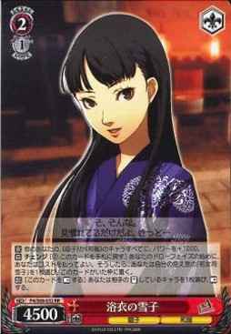【永】 他のあなたの、《扇子》か《和服》のキャラすべてに、パワーを+1000。 【自】 チェンジ [(2) このカードを手札に戻す] あなたのドローフェイズの始めに、あなたはコストを払ってよい。そうしたら、あなたは自分の控え室の「若女将 雪子」を1枚選び、このカードがいた枠に置く。 【起】[このカードを【レスト】する] あなたは相手の【スタンド】しているキャラを1枚選び、【レスト】する。