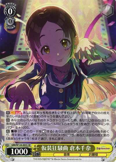 【永】【CXコンボ】 あなたは「あっちも行きたいですわ!」のチョイスの効果で自分の控え室のレベル0以下の《音楽》のキャラを選んでよい。 【自】 あなたのレベル0以下のキャラがトリガーした時、あなたは自分の、「日々、発見的ステップ! 倉本千奈」かレベル0以下のキャラを1枚選び、そのターン中、パワーを+1000。 【起】 集中 [(1) このカードを【レスト】する] あなたは自分の山札の上から4枚をめくり、控え室に置く。それらのカードのCX1枚につき、あなたは自分の控え室の《音楽》のキャラを1枚まで選び、手札に戻す。