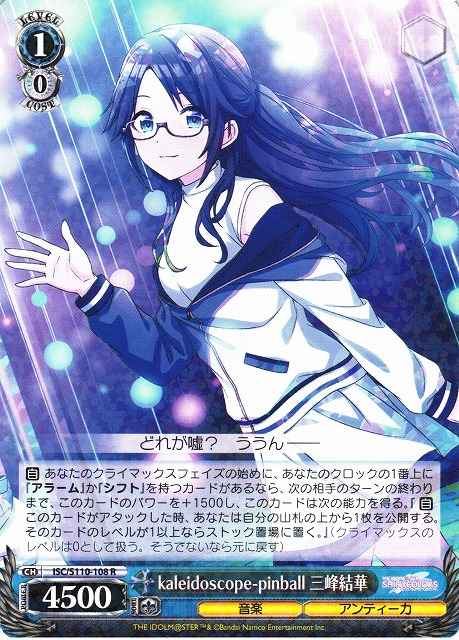 【自】 あなたのクライマックスフェイズの始めに、あなたのクロックの1番上に『アラーム』か『シフト』を持つカードがあるなら、次の相手のターンの終わりまで、このカードのパワーを+1500し、このカードは次の能力を得る。『【自】 このカードがアタックした時、あなたは自分の山札の上から1枚を公開する。そのカードのレベルが1以上ならストック置場に置く。』(クライマックスのレベルは0として扱う。そうでないなら元に戻す)
