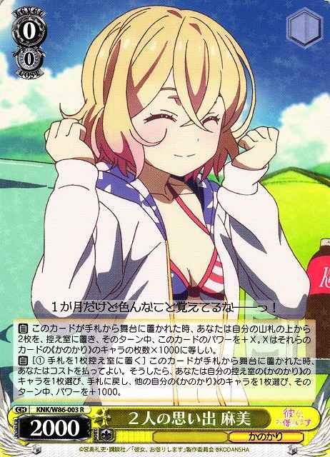 【自】 このカードが手札から舞台に置かれた時、あなたは自分の山札の上から2枚を、控え室に置き、そのターン中、このカードのパワーを+X。Xはそれらのカードの《かのかり》のキャラの枚数×1000に等しい。 【自】[(1) 手札を1枚控え室に置く] このカードが手札から舞台に置かれた時、あなたはコストを払ってよい。そうしたら、あなたは自分の控え室の《かのかり》のキャラを1枚選び、手札に戻し、他の自分の《かのかり》のキャラを1枚選び、そのターン中、パワーを+1000。