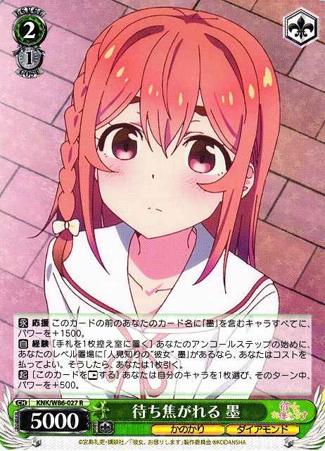 【永】 応援 このカードの前のあなたのカード名に「墨」を含むキャラすべてに、パワーを+1500。 【自】 経験 [手札を1枚控え室に置く] あなたのアンコールステップの始めに、あなたのレベル置場に「人見知りの“彼女" 墨」があるなら、あなたはコストを払ってよい。そうしたら、あなたは1枚引く。 【起】[このカードを【レスト】する] あなたは自分のキャラを1枚選び、そのターン中、パワーを+500。
