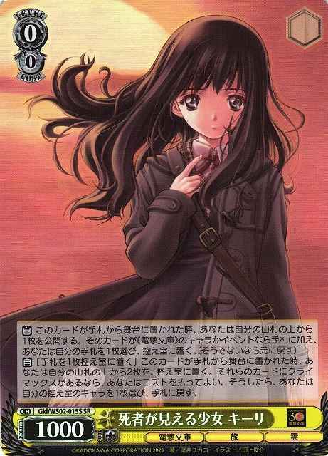 【自】 このカードが手札から舞台に置かれた時、あなたは自分の山札の上から1枚を公開する。そのカードが《電撃文庫》のキャラかイベントなら手札に加え、あなたは自分の手札を1枚選び、控え室に置く。(そうでないなら元に戻す)【自】[手札を1枚控え室に置く] このカードが手札から舞台に置かれた時、あなたは自分の山札の上から2枚を、控え室に置く、それらのカードにクライマックスがあるなら、あなたはコストを払ってよい。そうしたら、あなたは自分の控え室のキャラを1枚選び、手札に戻す。