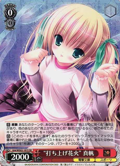 【永】 経験 あなたのターン中、あなたのレベル置場に「“雨上がりに咲く花” 智花」があり、他のあなたの「“雨上がりに咲く花” 智花」がいるなら、他のあなたのキャラすべてに、パワーを+1000。【自】[このカードを手札に戻す] あなたのクライマックスがクライマックス置場に置かれた時、あなたはコストを払ってよい。そうしたら、あなたは自分のキャラを1枚選び、そのターン中、パワーを+2000。