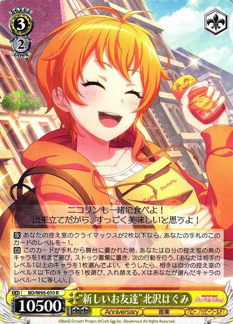 【永】 あなたの控え室のクライマックスが2枚以下なら、あなたの手札のこのカードのレベルを-1。【自】 このカードが手札から舞台に置かれた時、あなたは自分の控え室の黄のキャラを1枚まで選び、ストック置場に置き、次の行動を行う。『あなたは相手のレベル1以上のキャラを1枚選んでよい。そうしたら、相手は自分の控え室のレベルX以下のキャラを1枚選び、入れ替える。Xはあなたが選んだキャラのレベル-1に等しい。』