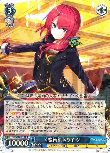 【自】[手札を1枚控え室に置く] このカードが手札から舞台に置かれた時、あなたはコストを払ってよい。そうしたら、あなたは自分のクロックの上から1枚を、ストック置場に置く。 【自】【CXコンボ】 記憶 [(1)] このカードがアタックした時、CX置場に「命を捧げた攻略法」があり、あなたの思い出置場の、《ファンタジア文庫》か《魔法》のキャラが4枚以上なら、あなたはコストを払ってよい。そうしたら、相手は自分の山札の上から4枚を公開し、その山札をシャッフルし、自分の山札の上からX枚を、クロック置場に置き、そのターン中、このカードのパワーを+2000。XはそれらのカードのCXの枚数に等しい。