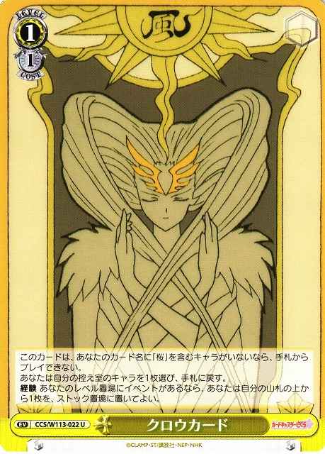 このカードは、あなたのカード名に「桜」を含むキャラがいないなら、手札からプレイできない。 あなたは自分の控え室のキャラを1枚選び、手札に戻す。 経験 あなたのレベル置場にイベントがあるなら、あなたは自分の山札の上から1枚を、ストック置場に置いてよい。