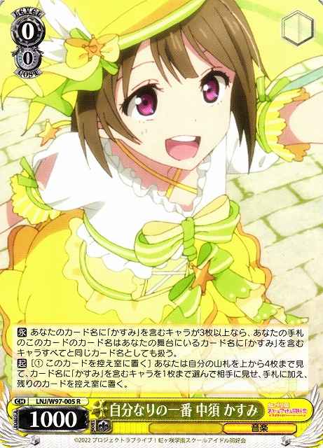 【永】 あなたのカード名に「かすみ」を含むキャラが3枚以上なら、あなたの手札のこのカードのカード名はあなたの舞台にいるカード名に「かすみ」を含むキャラすべてと同じカード名としても扱う。 【起】[(1) このカードを控え室に置く] あなたは自分の山札を上から4枚まで見て、カード名に「かすみ」を含むキャラを1枚まで選んで相手に見せ、手札に加え、残りのカードを控え室に置く。
