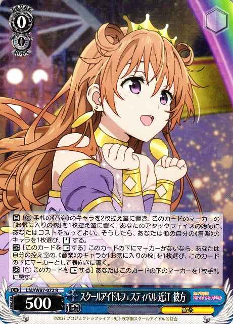 【自】[(2) 手札の《音楽》のキャラを2枚控え室に置き、このカードのマーカーの「お気に入りの枕」を1枚控え室に置く] あなたのアタックフェイズの始めに、あなたはコストを払ってよい。そうしたら、あなたは他の自分の《音楽》のキャラを1枚選び、【スタンド】する。 【起】[このカードを【レスト】する] このカードの下にマーカーがないなら、あなたは自分の控え室の、《音楽》のキャラか「お気に入りの枕」を1枚選び、このカードの下にマーカーとして表向きに置く。 【起】[(1) このカードを【レスト】する] あなたはこのカードの下のマーカーを1枚手札に戻す。