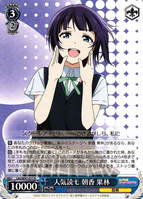 【永】 あなたのクロック置場に「高みのステージへ 朝香 果林」があるなら、あなたの手札のこのカードのレベルを-1。 【自】[手札を2枚控え室に置く] このカードが手札から舞台に置かれた時、あなたはコストを払ってよい。そうしたら、あなたは自分の山札を上から4枚まで見て、《音楽》のキャラかイベントを1枚まで選んで相手に見せ、手札に加え、残りのカードを控え室に置き、自分のクロックの上から1枚までを、ストック置場に置く。