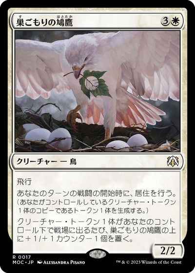 飛行 あなたのターンの戦闘の開始時に、居住を行う。(あなたがコントロールしているクリーチャー・トークン1体のコピーであるトークン1体を生成する。) クリーチャー・トークン1体があなたのコントロール下で戦場に出るたび、巣ごもりの鳩鷹の上に+1/+1カウンター1個を置く。