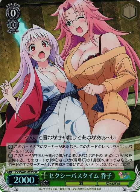 【永】 このカードの下にマーカーがあるなら、このカードのレベルを+1し、パワーを+1500。 【自】 このカードが手札から舞台に置かれた時、あなたは自分の山札の上から1枚を公開する。そのカードが《ゆらぎ荘》か《湯煙町》か《漫画》のキャラならこのカードの下にマーカーとして表向きに置いてよい。(そうしないなら元に戻す)
