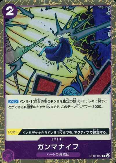 【メイン】ドン!!1(自分の場のドン!!を指定の数ドン!!デッキに戻すことができる):相手のキャラ1枚までを、このターン中、パワー5000。 【トリガー】ドン!!デッキからドン!!1枚までを、アクティブで追加する。