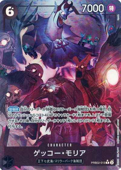 【登場時】自分のリーダーが特徴《スリラーバーク海賊団》を持つ場合、自分のトラッシュからコスト4以下のキャラカード1枚までを、レストで登場させる。その後、自分のリーダーかキャラ1枚にレストのドン!!1枚までを、付与する。