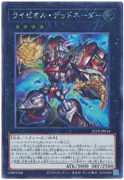レベル4「ライゼオル」モンスター×2体以上 このカード名の(1)(3)の効果はそれぞれ1ターンに1度しか使用できない。(1):このカードが特殊召喚した場合に発動できる。自分の墓地のモンスター1体をこのカードのX素材とする。(2):相手がカードの効果を発動した時、このカードのX素材を1つ取り除き、フィールドのカード1枚を対象として発動できる。そのカードを破壊する。(3):自分フィールドのXモンスターが戦闘・効果で破壊される場合、代わりにこのカードのX素材を1つ取り除く事ができる。