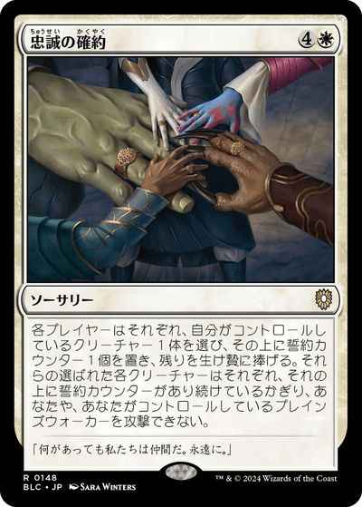 各プレイヤーはそれぞれ、自分がコントロールしているクリーチャー1体を選び、その上に誓約(vow)カウンター1個を置き、残りを生け贄に捧げる。選ばれた各クリーチャーはそれぞれ、それの上に誓約カウンターが置かれ続けているかぎり、あなたや、あなたがコントロールしているプレインズウォーカーを攻撃できない。