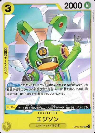 【起動メイン】このキャラをトラッシュに置くことができる:自分のライフの枚数が相手のライフの枚数以下の場合、カード1枚を引く。その後、相手のコスト3以下のキャラ1枚までを、レストにする。 【トリガー】カード1枚を引き、相手のコスト3以下のキャラ1枚までを、レストにする。