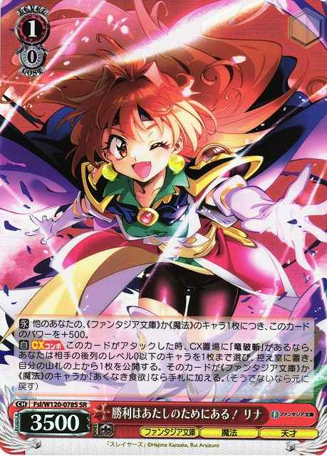 【永】 他のあなたの、《ファンタジア文庫》か《魔法》のキャラ1枚につき、このカードのパワーを+500。 【自】【CXコンボ】 このカードがアタックした時、CX置場に「竜破斬」があるなら、あなたは相手の後列のレベル0以下のキャラを1枚まで選び、控え室に置き、自分の山札の上から1枚を公開する。そのカードが《ファンタジア文庫》か《魔法》のキャラか「あくなき食欲」なら手札に加える。(そうでないなら元に戻す)