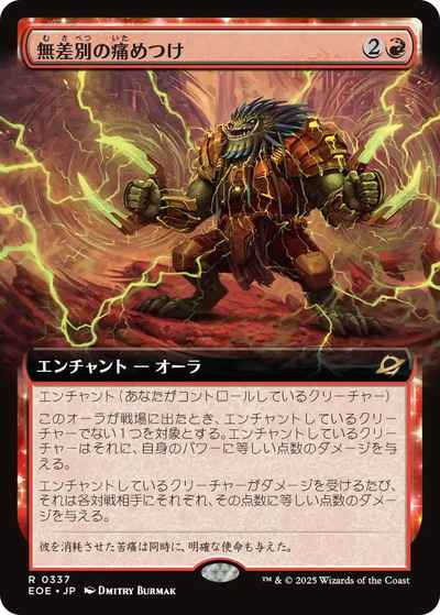 エンチャントしているクリーチャーがダメージを受けるたび、それは各対戦相手にそれぞれ、その点数に等しい点数のダメージを与える。