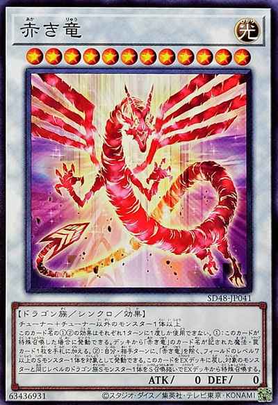 チューナー+チューナー以外のモンスター1体以上 このカード名の(1)(2)の効果はそれぞれ1ターンに1度しか使用できない。(1):このカードが特殊召喚した場合に発動できる。デッキから「赤き竜」のカード名が記された魔法・罠カード1枚を手札に加える。(2):自分・相手ターンに、「赤き竜」を除く、フィールドのレベル7以上のSモンスター1体を対象として発動できる。このカードをEXデッキに戻し、対象のモンスターと同じレベルのドラゴン族Sモンスター1体をS召喚扱いでEXデッキから特殊召喚する。