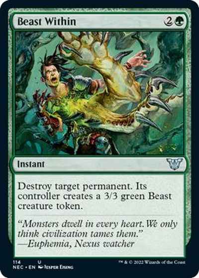 パーマネント1つを対象とし、それを破壊する。それのコントローラーは緑の3/3のビースト(Beast)・クリーチャー・トークン1体を生成する。