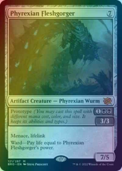 Menace, lifelink Ward --- Pay life equal to Phyrexian Fleshgorger's power. //PRT-Prototype_Mech// {1}{B}{B} Prototype (You may cast this spell with different mana cost, color, and size. It keeps its abilities and types.) 3/3