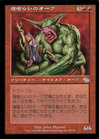 トランプル 魂喰らいのオーグが戦場に出たとき、あなたは1点のライフを残してすべてのライフを失う。 魂喰らいのオーグが戦場を離れたとき、あなたは魂喰らいのオーグが戦場に出たときに失ったライフに等しい点数のライフを得る。