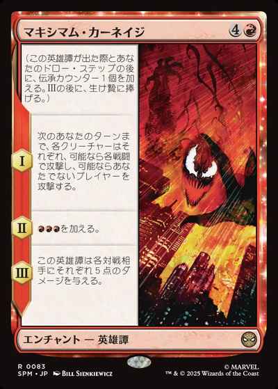 (この英雄譚(Saga)が出た際とあなたのドロー・ステップの後に、伝承(lore)カウンター1個を加える。IIIの後に、生け贄に捧げる。) I ― 次のあなたのターンまで、各クリーチャーはそれぞれ、可能なら各戦闘で攻撃し、可能ならあなたでないプレイヤーを攻撃する。 II ― (赤)(赤)(赤)を加える。 III ― この英雄譚は各対戦相手にそれぞれ5点のダメージを与える。