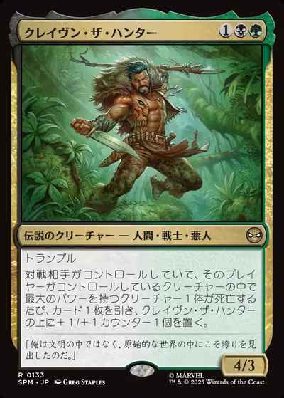 トランプル 対戦相手がコントロールしていて、そのプレイヤーがコントロールしているクリーチャーの中で最大のパワーを持つクリーチャー1体が死亡するたび、カード1枚を引き、クレイヴン・ザ・ハンターの上に+1/+1カウンター1個を置く。
