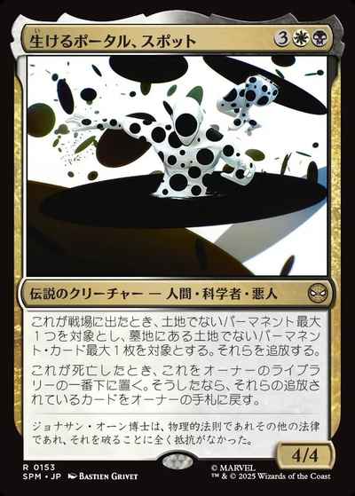 生けるポータル、スポットが戦場に出たとき、土地でないパーマネント最大1つを対象とし、墓地にある土地でないパーマネント・カード最大1枚を対象とする。それらを追放する。 生けるポータル、スポットが死亡したとき、これをオーナーのライブラリーの一番下に置く。そうしたなら、それらの追放されているカードをオーナーの手札に戻す。