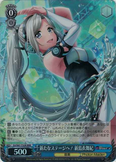 【自】 あなたのクライマックスがクライマックス置場に置かれた時、あなたは自分の山札を上から2枚まで見て、山札の上に好きな順番で置く。 【起】 集中 [(1) このカードを【レスト】する] あなたは自分の山札の上から5枚をめくり、控え室に置く。それらのカードのクライマックス1枚につき、あなたは1枚まで引く。