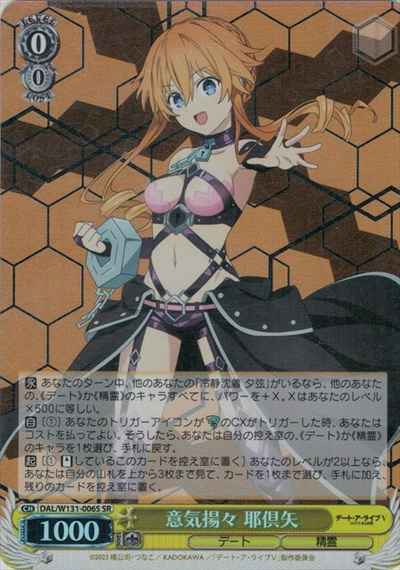 【永】 あなたのターン中、他のあなたの「冷静沈着 夕弦」がいるなら、他のあなたの、《デート》か《精霊》のキャラすべてに、パワーを+X。Xはあなたのレベル×500に等しい。 【自】[(1)] あなたのトリガーアイコンがリターンのCXがトリガーした時、あなたはコストを払ってよい。そうしたら、あなたは自分の控え室の、《デート》か《精霊》のキャラを1枚選び、手札に戻す。 【起】[(1) 【スタンド】しているこのカードを控え室に置く] あなたのレベルが2以上なら、あなたは自分の山札を上から3枚まで見て、カードを1枚まで選び、手札に加え、残りのカードを控え室に置く。
