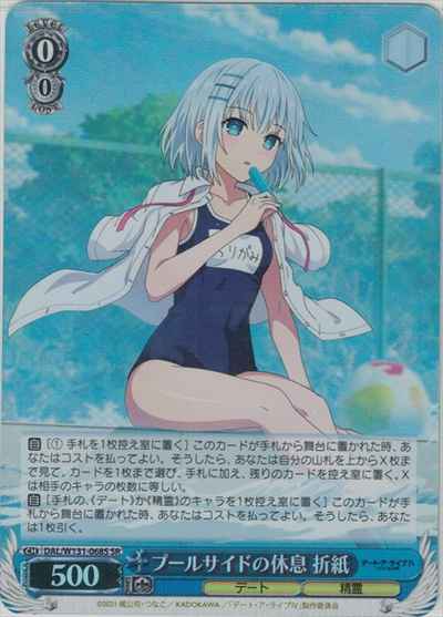 【自】[(1) 手札を1枚控え室に置く] このカードが手札から舞台に置かれた時、あなたはコストを払ってよい。そうしたら、あなたは自分の山札を上からX枚まで見て、カードを1枚まで選び、手札に加え、残りのカードを控え室に置く。Xは相手のキャラの枚数に等しい。 【自】[手札の、《デート》か《精霊》のキャラを1枚控え室に置く] このカードが手札から舞台に置かれた時、あなたはコストを払ってよい。そうしたら、あなたは1枚引く。