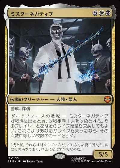 警戒、絆魂 ダークフォースの反転 ― ミスターネガティブが戦場に出たとき、対戦相手1人を対象とする。そのプレイヤーとあなたのライフ総量を交換してもよい。これによりあなたがライフを失ったなら、その点数に等しい枚数のカードを引く。