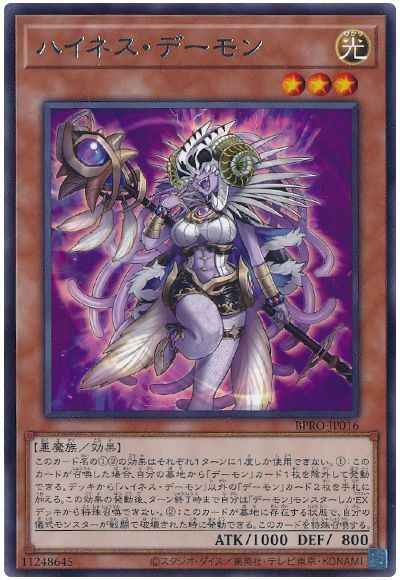 このカード名の(1)(2)の効果はそれぞれ1ターンに1度しか使用できない。(1):このカードが召喚した場合、自分の墓地から「デーモン」カード1枚を除外して発動できる。デッキから「ハイネス・デーモン」以外の「デーモン」カード2枚を手札に加える。この効果の発動後、ターン終了時まで自分は「デーモン」モンスターしかEXデッキから特殊召喚できない。(2):このカードが墓地に存在する状態で、自分の儀式モンスターが戦闘で破壊された時に発動できる。このカードを特殊召喚する。