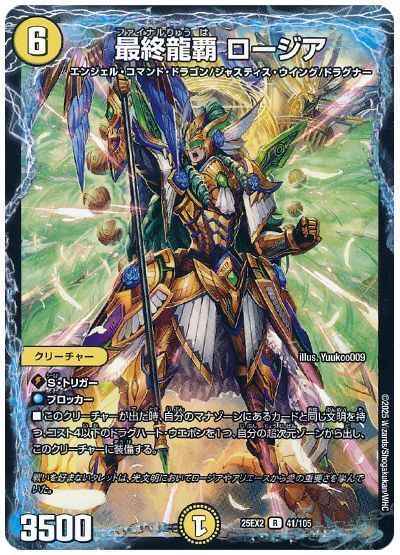 S・トリガーブロッカーこのクリ―チャーが出た時、自分のマナゾーンにあるカードと同じ文明を持つ、コスト4以下のドラグハート・ウエポンを1つ、自分の超次元ゾーンから出し、このクリーチャーに装備する。