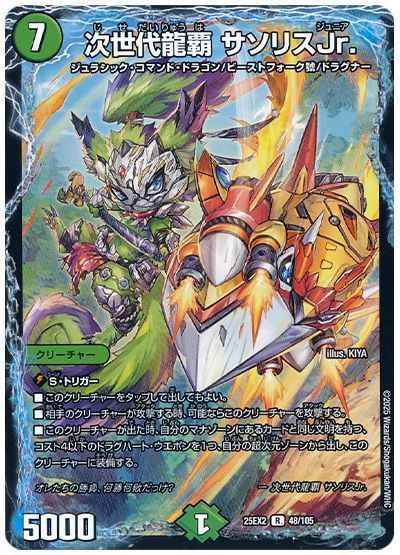 S・トリガーこのクリーチャーをタップして出してもよい。相手のクリーチャーが攻撃する時、可能ならこのクリーチャーを攻撃する。このクリーチャーが出た時、自分のマナゾーンにあるカードと同じ文明を持つ、コスト4以下のドラグハート・ウエポンを1つ、自分の超次元ゾーンから出し、このクリーチャーに装備する。