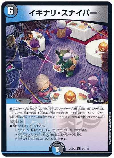 このカードが自分の手札にあり、相手のクリーチャーが3体以上あれば、この呪文に「S・バック:水または闇」を与える。(水または闇のカードを自分のシールドゾーンから手札に加える時、そのカードを捨ててもよい。そうしたら、コストを支払わずにこのカードを実行する)次のうちいずれか1つを選ぶ。?このターン、相手のクリーチャーすべてのパワーを-3000する。?相手のエレメントを1つ選び、持ち主の超次元ゾーンに置く。?相手の手札を2枚見ないで選び、捨てさせる。